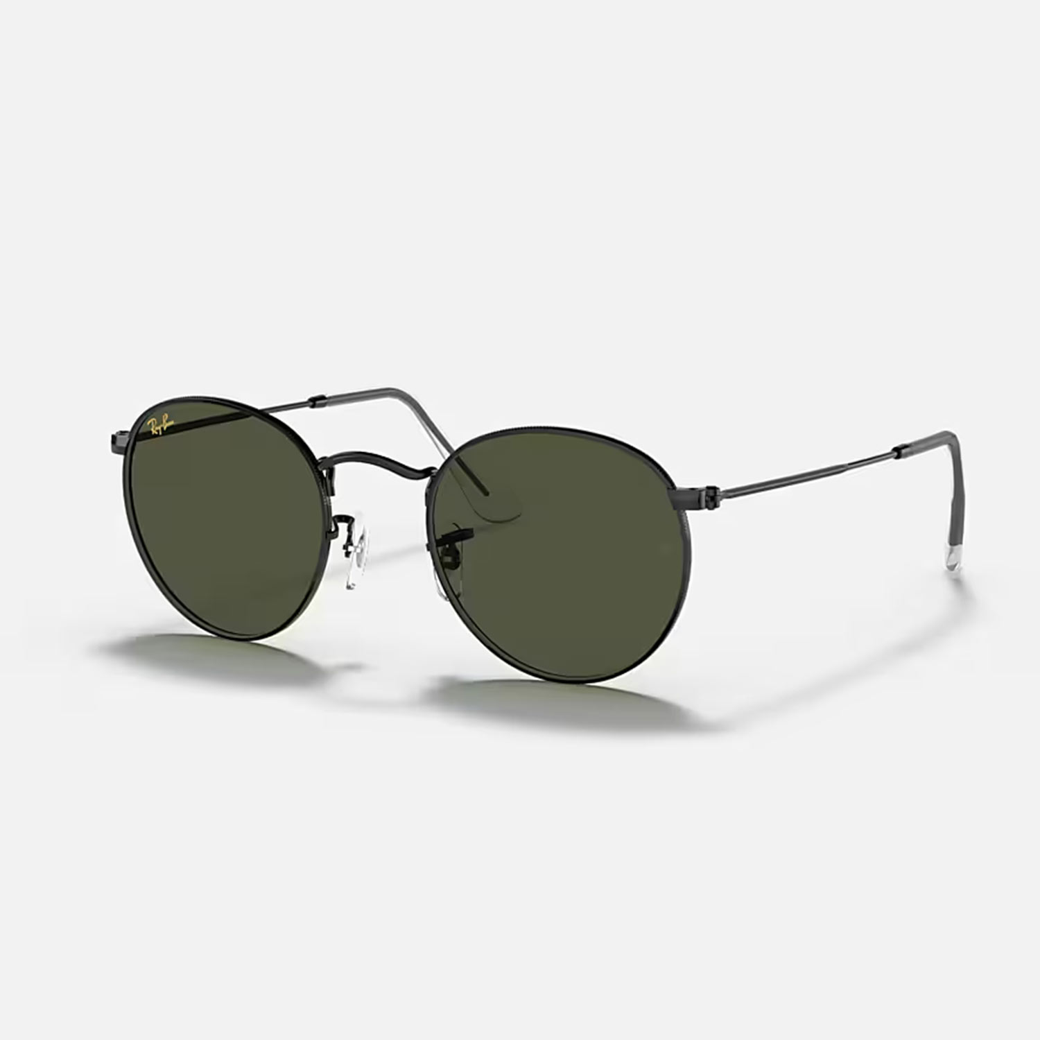 The Ray-Ban unisex metal, iconic Sunglasses are known for their defined round crystal lenses and distinct shape. A curved brow bar, adjustable nose pads, and thin metal temples with plastic end tips rest comfortably behind the ears.
