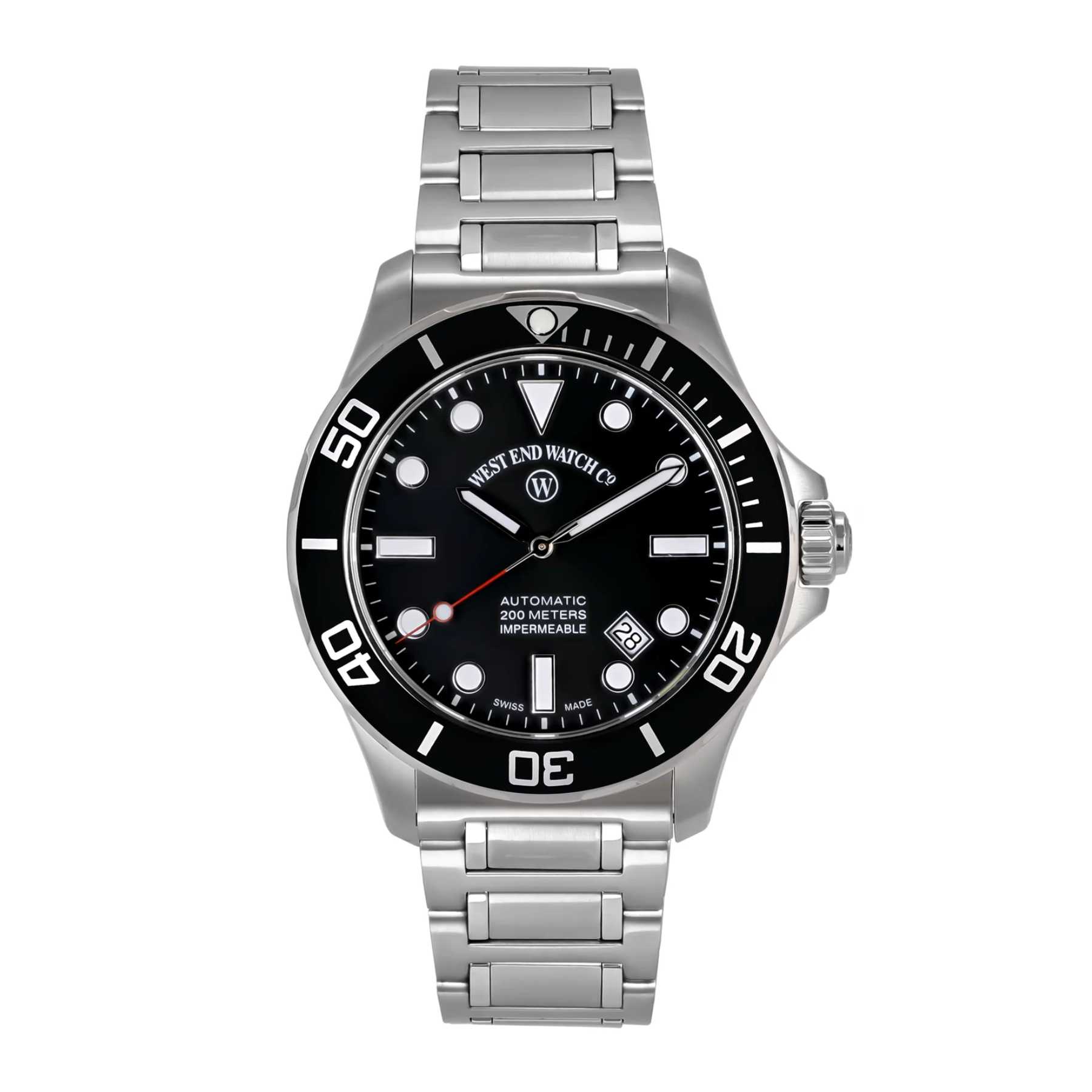 This West End The Impermeable men’s 42mm diver’s watch offers a perfect blend of durability and style. With a robust stainless steel case and bracelet, it features a bold black dial and matching black bezel for a sleek, understated look. Powered by reliable quartz movement, this timepiece is built to perform in any environment, making it an ideal choice for both underwater adventures and everyday wear.