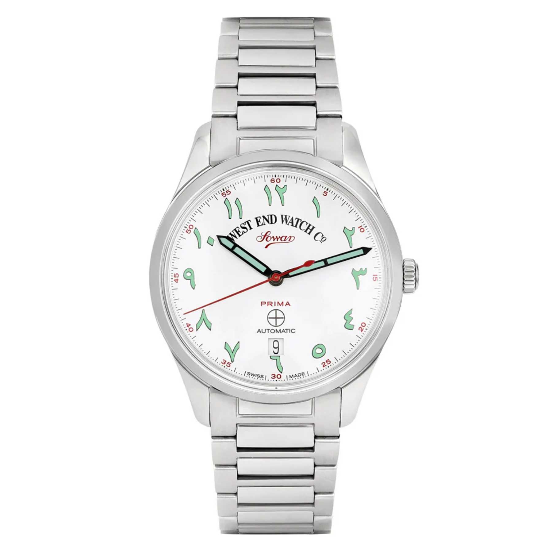 This men?s Sowar Prima automatic watch offers a blend of elegance and functionality, featuring a 39mm stainless steel case and matching stainless steel bracelet. The clean white dial is accented by luminous Eastern Arabic numerals, ensuring easy readability and a unique aesthetic. With a classic 3-hand design and a convenient date display, this timepiece is powered by an automatic movement for reliable, battery-free operation. Perfect for both formal and everyday wear, it?s a sophisticated choice for those who appreciate timeless style with modern details.