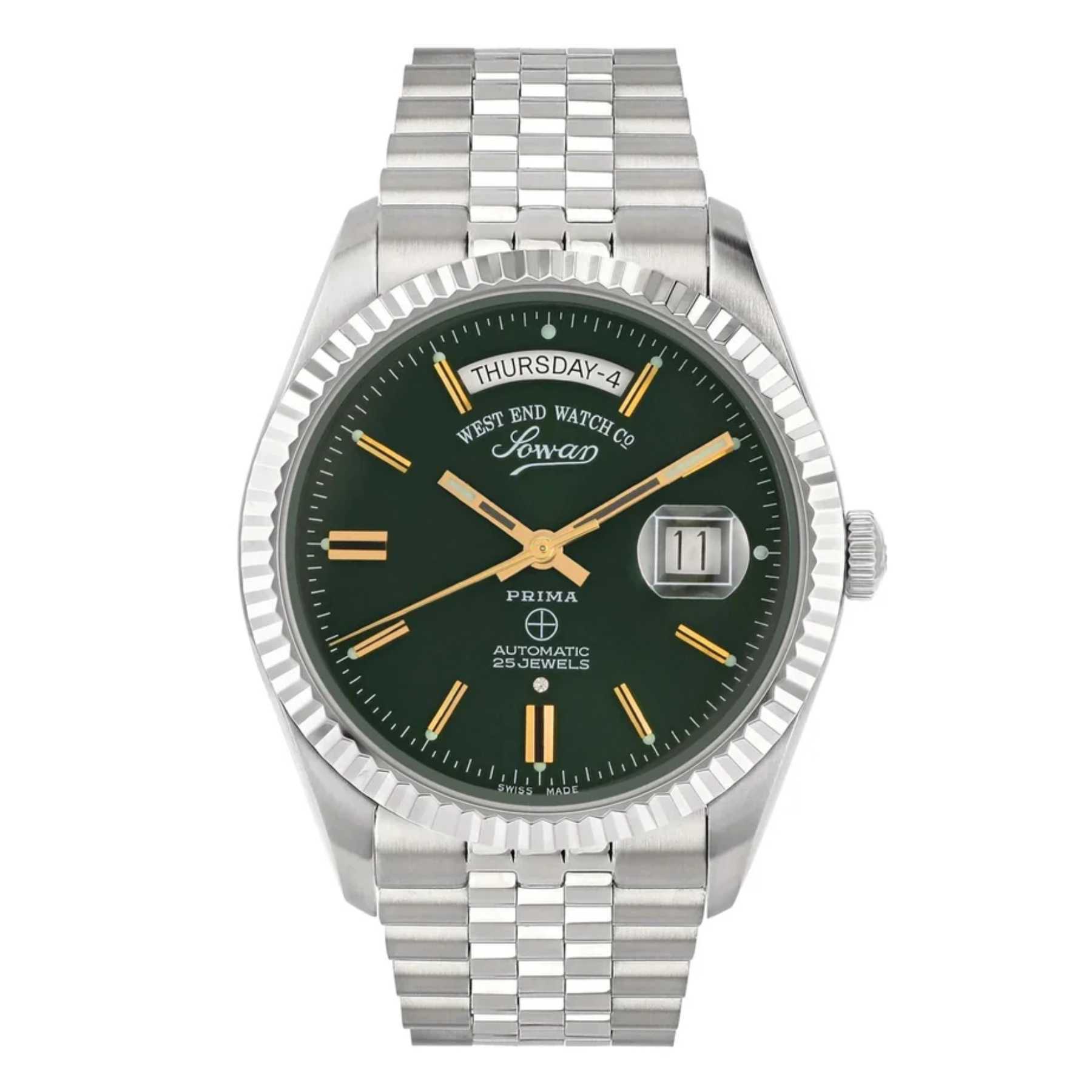 Add a sophisticated touch to your wrist with the West End The Classics XL automatic watch, designed for the modern man. Featuring a 41mm round stainless steel case in silver, this timepiece boasts a stunning green dial that stands out with its vibrant hue. The two-tone stainless steel and gold strap adds a luxurious contrast, ensuring that this watch makes a statement. Powered by an automatic movement, this watch provides precise timekeeping with no need for batteries. Perfect for both casual and formal occasions, it?s an essential accessory that brings elegance and functionality together.