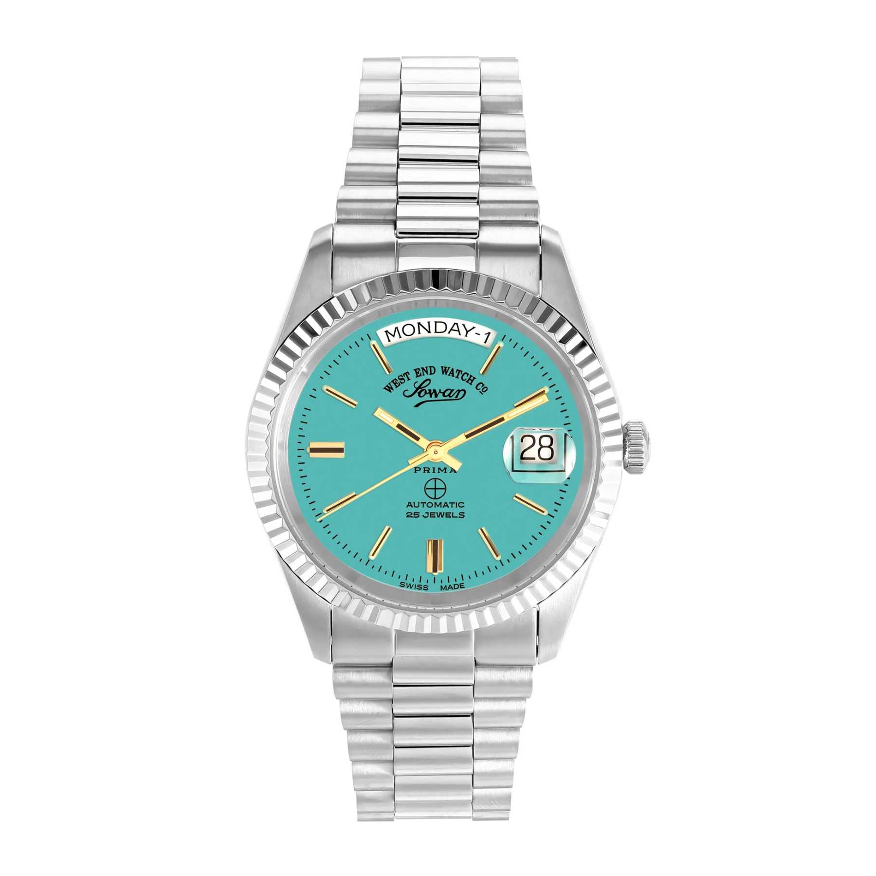 Introducing this unisex West End Watch from The Classics collection?where timeless elegance meets refined design. This exquisite timepiece features a sleek 37 mm stainless steel case paired with a matching stainless steel bracelet for a cohesive, sophisticated look. The dial in a stunning turquoise shade serves as a bold yet tasteful backdrop, perfectly complementing the luminous gold indices that add a touch of warmth and luxury. Whether for day-to-day wear or special occasions, this watch is a stylish and enduring accessory that speaks to impeccable taste and classic appeal.