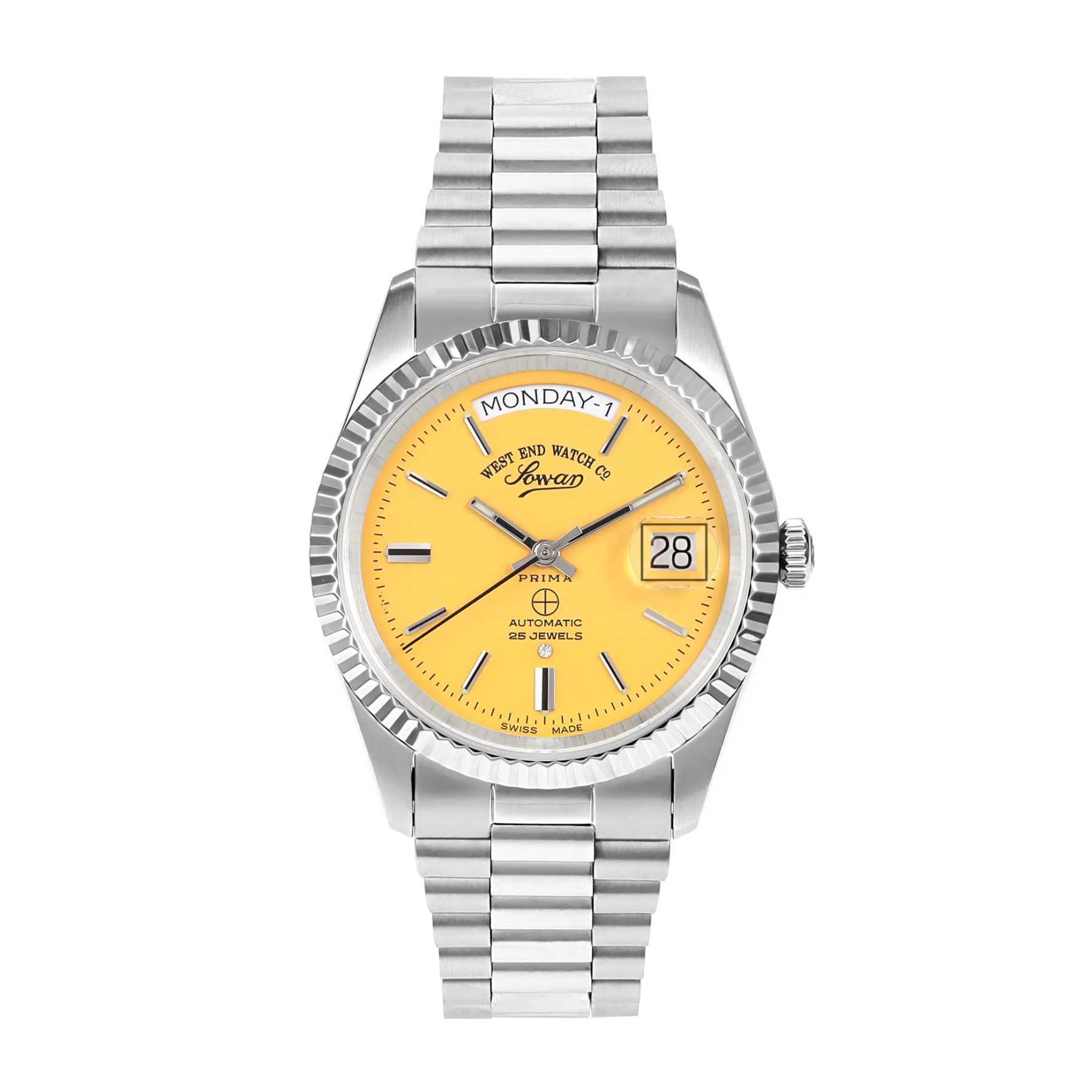 Indulge in timeless sophistication with this unisex automatic watch from West End The Classics collection. With a shimmering yellow dial and sleek silver strap, this 37mm watch with gold indices exudes luxury. Let the automatic movement keep you on time while making a statement of elegance.