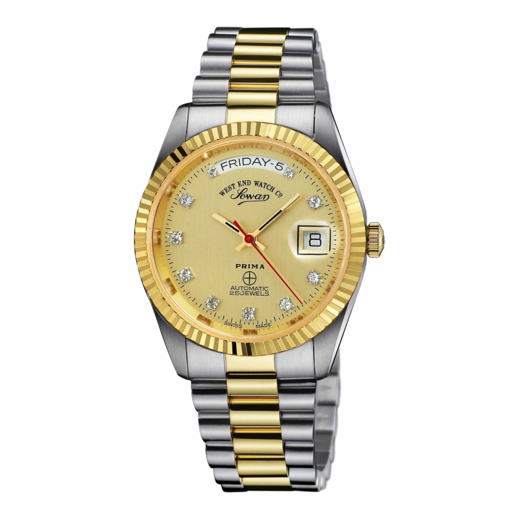 The West End 37mm unisex watch from The Classics collection combines sophistication and style in one versatile timepiece. Featuring a vertical brushed champagne champagne dial that radiates elegance, this watch boasts a sleek silver stainless steel case with a striking gold bezel. The 2-tone stainless steel strap ensures both durability and comfort, while the automatic movement guarantees precision. With its timeless round case and unisex design, this watch is perfect for any occasion, offering both style and functionality in a single, beautifully crafted accessory.