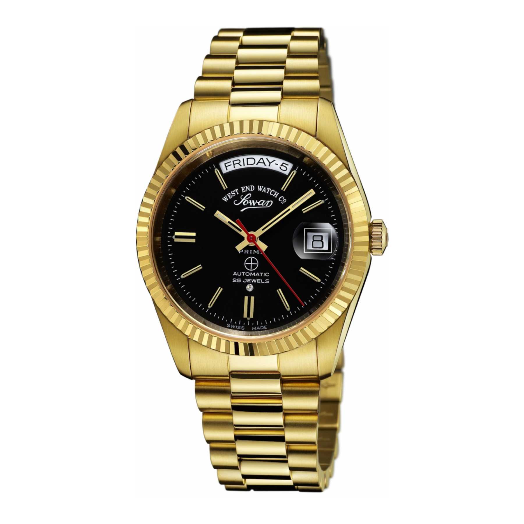 The West End 37mm unisex watch from The Classics collection combines timeless style with precision. Featuring a sleek black dial with gold indices, this watch offers a bold yet sophisticated look. The gold stainless steel case and strap add a luxurious touch, while the automatic movement ensures reliable performance. Perfect for any occasion, this round-cased timepiece is a versatile addition to any collection.