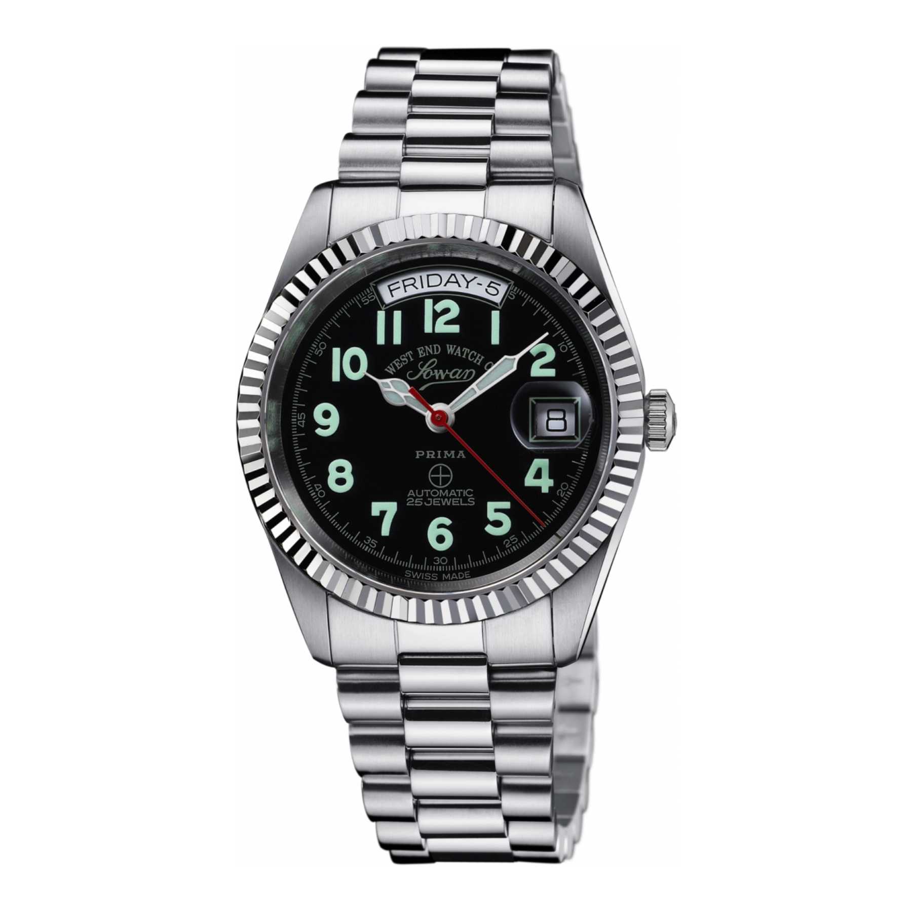 Indulge in the elegance of the unisex automatic watch from West End’s The Classics in 37mm case. The black dial with luminuos Western Arabic markers and silver strap exude sophistication and luxury. Let it adorn your wrist and elevate your style to new heights. Experience the effortless charm and timeless design of this automatic watch.